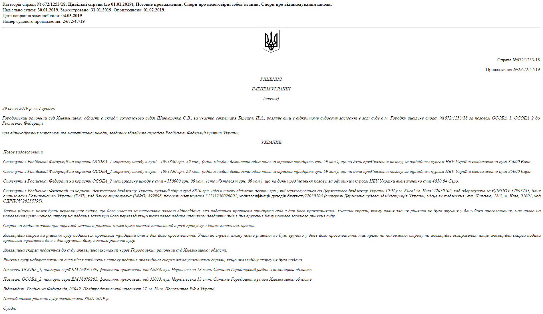 The public organization "European Society for Reconstruction and Development" has taken on the mission of forcing the aggressor to pay the people affected by his actions. Our lawyers have established a positive practice for compensation of damages in the amount of more than 1 million hryvnia for each person who left their place of permanent residence and became an internally displaced person (VPO).